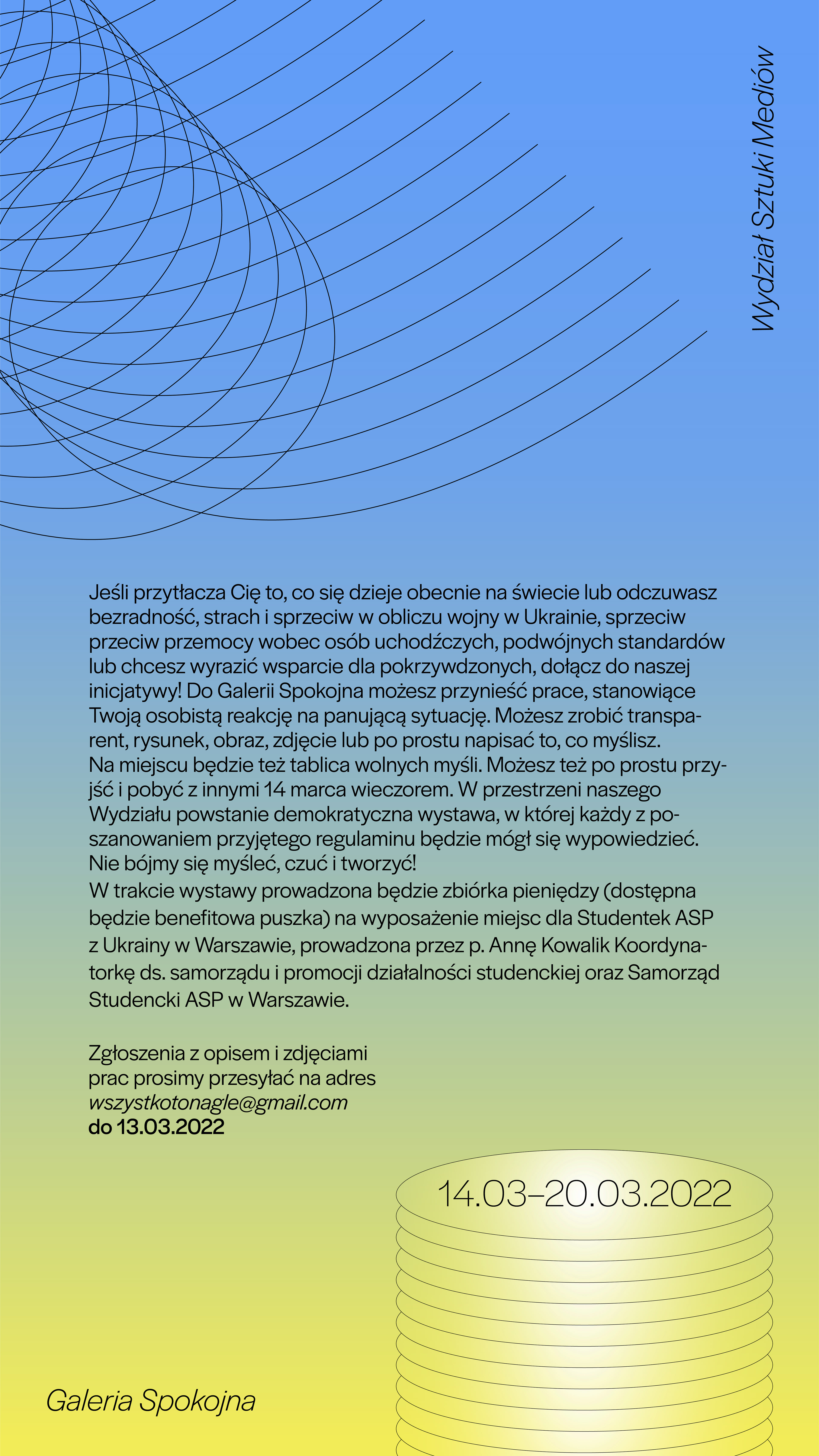 If you are overwhelmed by what is happening in the world today, you feel helpless, fear or angry in the face of the war in Ukraine, opposition to violence against refugees, double standards or you want to express support for the victims, join our initiative! You can bring your works to the Spokojna Gallery, which are your personal reaction to the current situation. You can make a banner, drawing, picture, photo or just write what you think. There will also be a free thoughts board. Or you can just come and hang out with the others on the evening of March 14. A democratic exhibition will be created in the space of our Faculty, in which everyone will be able to express their views while respecting the adopted regulations. Let's not be afraid to think, feel and create.